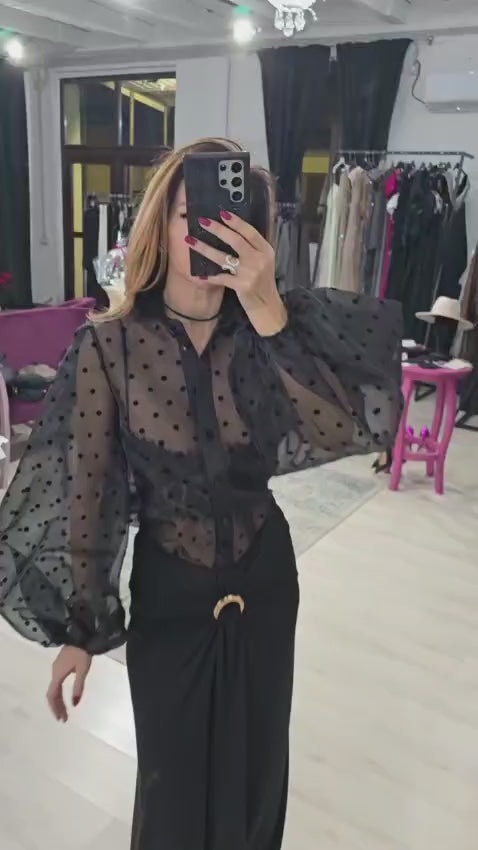 Această bluză damă este o piesă vestimentară îndrăzneață și feminină, ideală pentru apariții stilate de zi sau evenimente casual-elegante. Mâneca bufantă și imprimeul cu buline adaugă un plus de personalitate și rafinament, evidențiind subtil stilul și creativitatea purtătoarei.