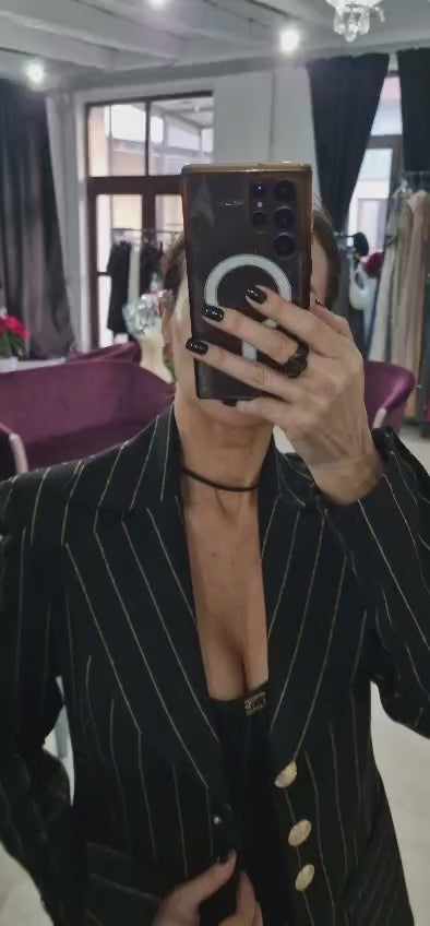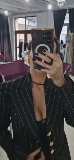 Compleu dama cu dungi aurii, rafinat, de culoare neagra, dungile subtiri confera un aer sofisticat si modern. Sacoul este pus in valoare de nasturii metalici aurii, cu design elegant, ce adauga un accent luxos tinutei. Pantalonii sunt croiti impecabil si prezinta vipusca din dantela fina, detaliu feminin si delicat ce evidentiaza atentia la finisaje si stil.