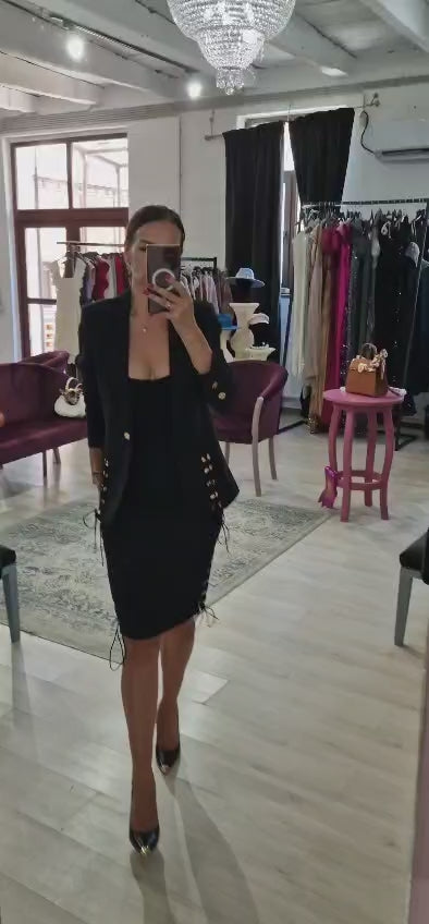 Fusta conică este pusă în valoare de detalii aurii tip capse cu șiret, amplasate lateral, care adaugă un accent modern și îndrăzneț ținutei. Aceste detalii decorative oferă un plus de stil și exclusivitate, transformând compleul într-o piesă statement.