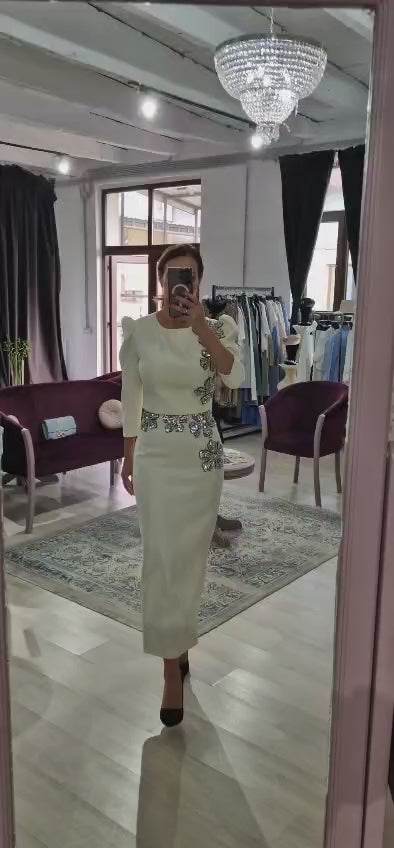 Compleu dama de ocazie, accesorizat cu cristale aplicate pe bluza si pe fusta, șliț pe partea din spate a fustei. Compozitie 97% Poliester. 3% Lycra.