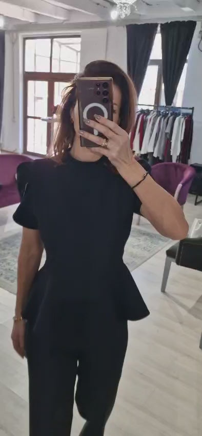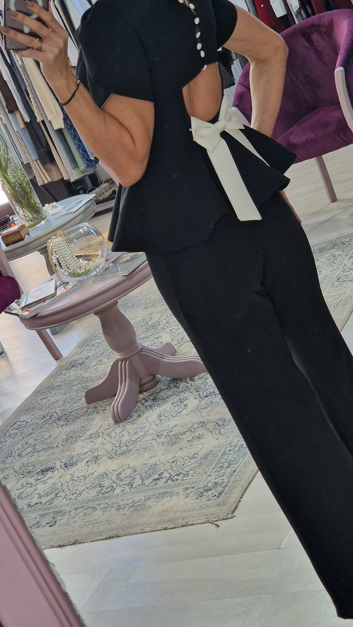 Compleu dama negru, cu inchidere la spate si detaliu elegant- funda alba aplicata in partea din spate. Un model rafinat, cu design deosebit. Compozitie 100% Poliester.