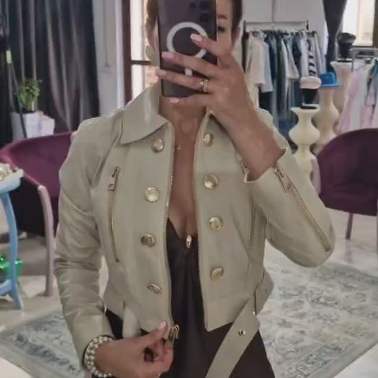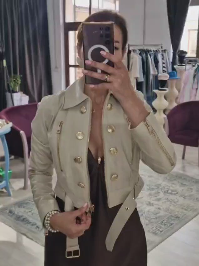Geacă damă din piele naturală, într-o nuanță elegantă de crem, ideală pentru un look rafinat și versatil. Realizată de brandul FLO&CLO din piele moale, de calitate superioară, oferă confort și durabilitate pe termen lung. Croiala este modernă, ușor cambrată, pana la nivelul taliei, evidențiind silueta feminină. Culoarea crem o face ușor de asortat atât cu ținute casual, cât și cu outfituri elegante, fiind perfectă pentru sezonul de primăvară și toamnă.