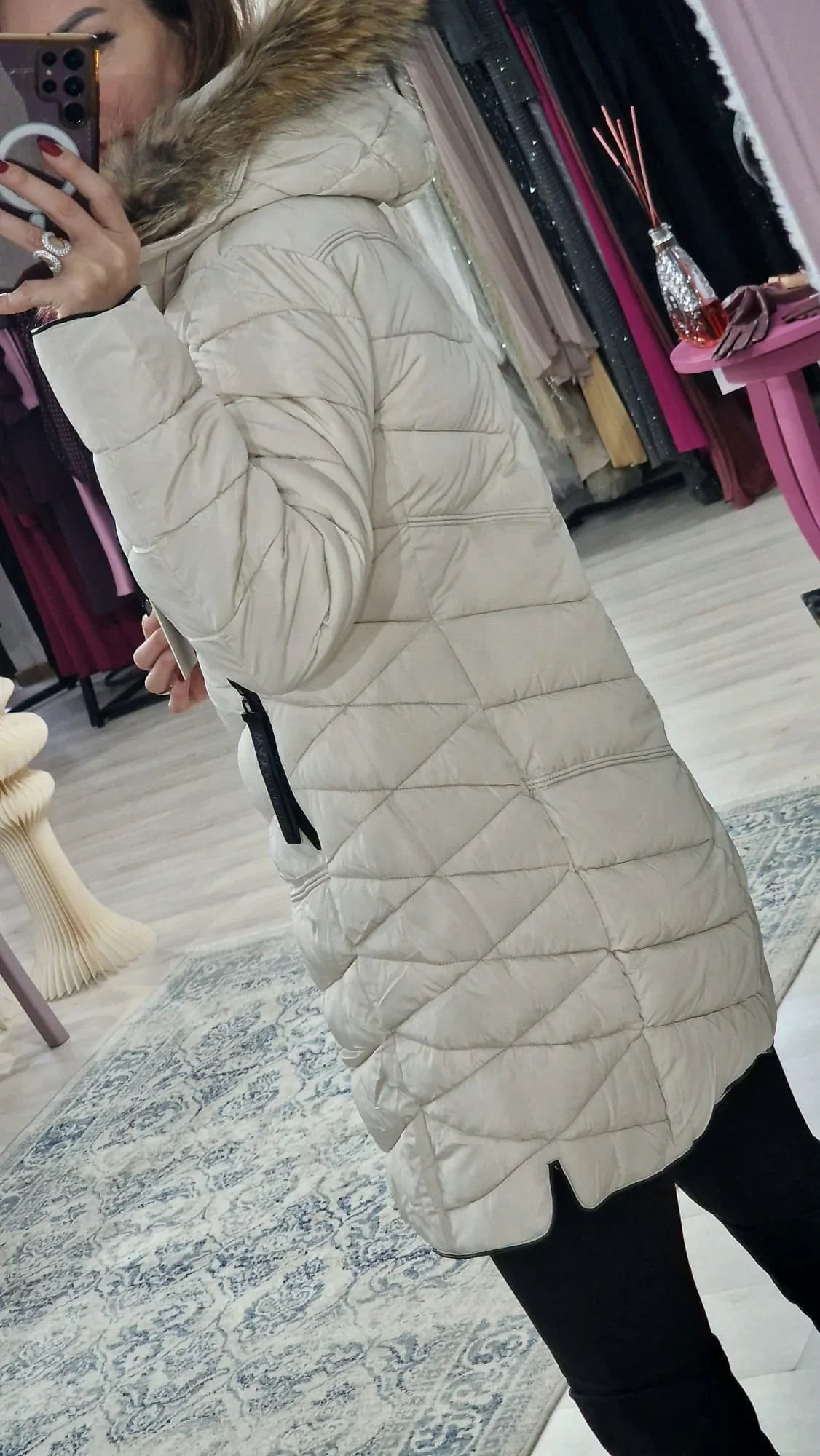 Această geacă damă lungă matlasată combină confortul și eleganța, fiind ideală pentru sezonul rece. Gluga prevăzută cu detalii din blană artificială detașabilă oferă un plus de rafinament și versatilitate, adaptându-se ușor stilului tău.