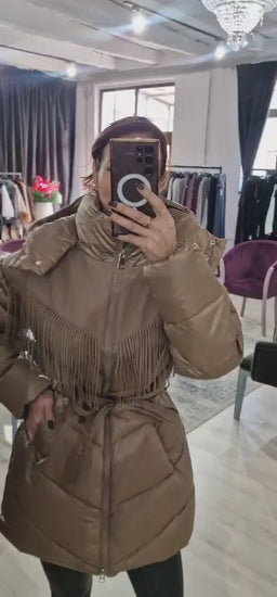 Geaca dama matlasata, moderna, realizata din material rezistent si confortabil, ideala pentru sezonul rece. Designul este completat de detalii cu franjuri, care adauga un aer original si stilat, oferind un plus de personalitate tinutei. Gluga practica asigura protectie impotriva vantului si frigului, fiind atat functionala cat si estetic integrata in design.