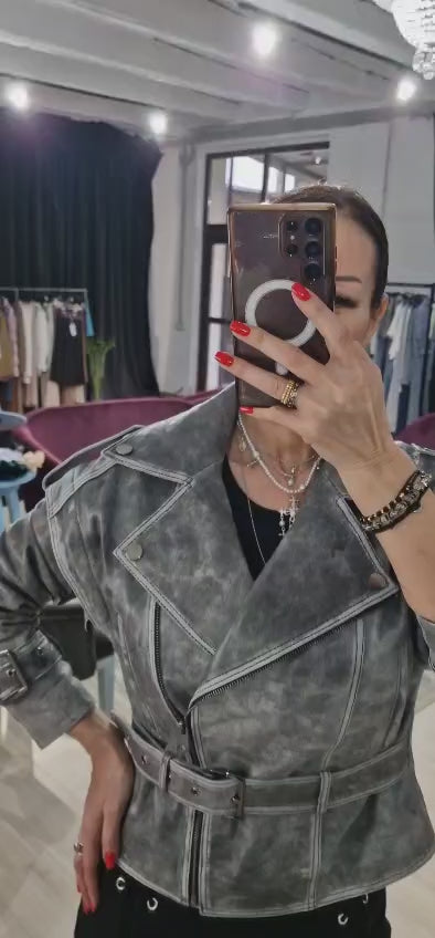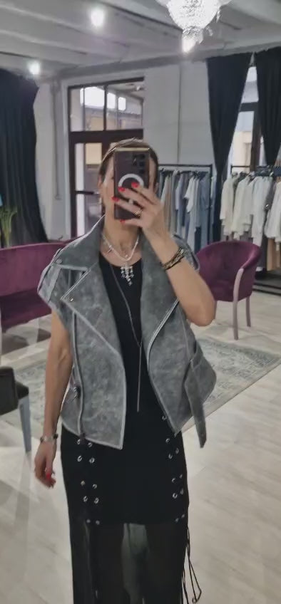 Geaca din piele gri, 2 in 1, cu maneci detasabile prin fermoar-se transforma usor intr-o vesta versatila pentru un look urban si practic. Compozitie 100% Piele naturala.