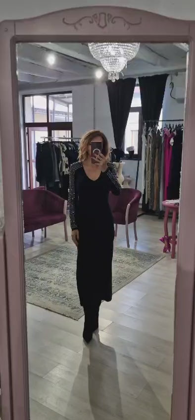Această rochie damă elegantă din tricot ușor elastic este o alegere rafinată pentru evenimente speciale și ocazii deosebite. Mâneca decorată cu cristale adaugă un plus de strălucire, iar decupajul subtil din partea din spate oferă un detaliu modern și feminin.