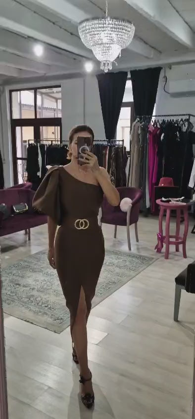 Această rochie damă elegantă este o piesă feminină și rafinată, potrivită atât pentru evenimente speciale, cât și pentru apariții elegante de seară. Designul este evidențiat de mâneca bufantă, care adaugă un aer sofisticat, și de cureaua din talie, menită să pună în valoare silueta într-un mod armonios.