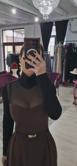 Această rochie de zi impresionează prin detalii delicate din tull, care adaugă un aer feminin și rafinat întregii ținute. Croiala simplă și elegantă este completată de închiderea cu fermoar pe spate, asigurând confort și un aspect impecabil.