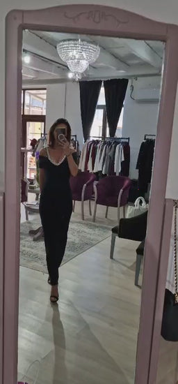 Rochie dama eleganta, realizata dintr-un material usor elastic, ce evidentiaza silueta. Designul rafinat este completat de pietre decorative atasate pe bretele, ce adauga un plus de stralucire si feminitate. Compozitie: 95% Poliester, 5% Elastan.