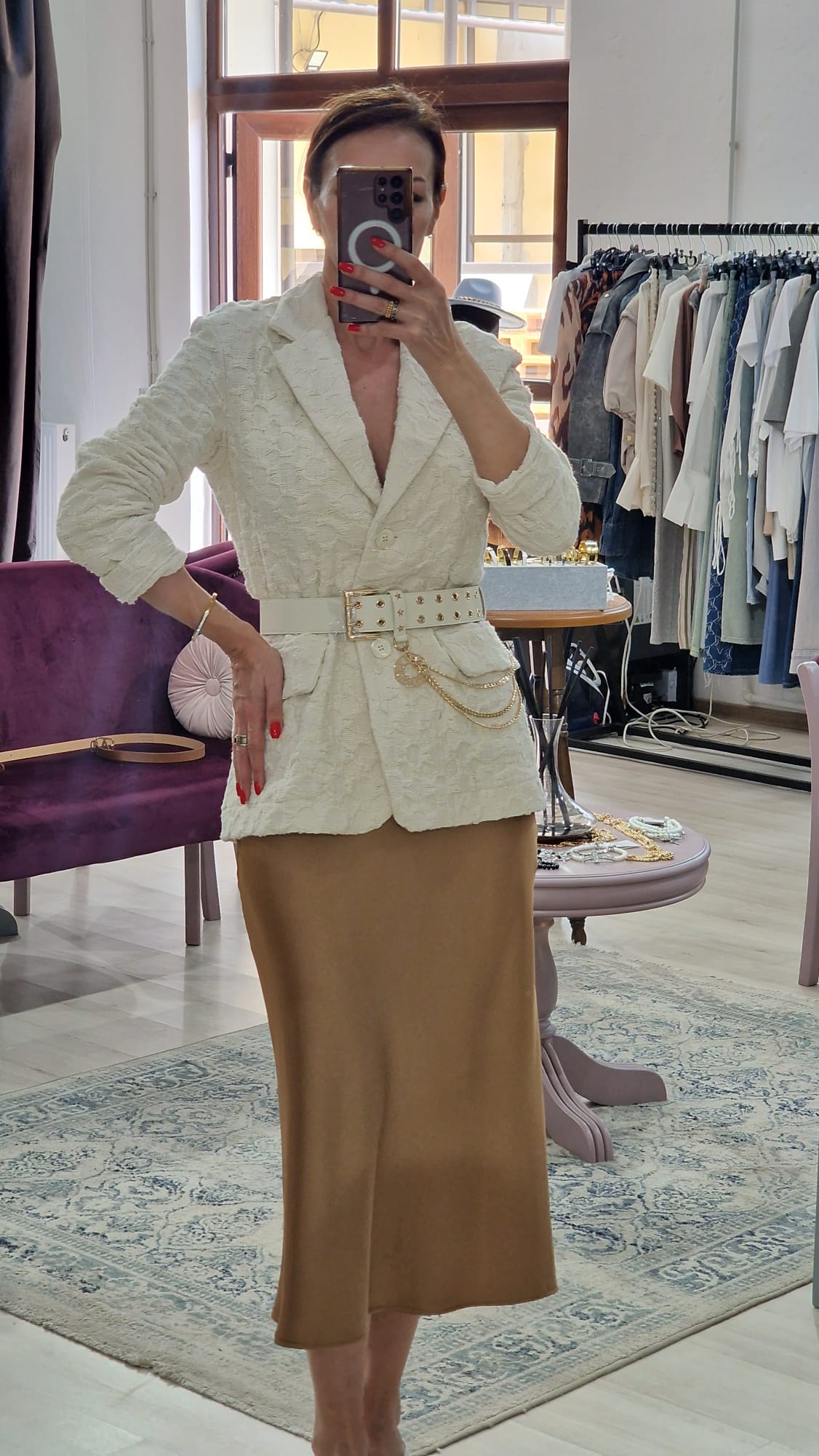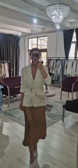 Sacou dama cambrat, creat pentru a evidentia armonios silueta. Este prevazut cu curea in talie, care accentueaza forma corpului si ofera un plus de feminitate tinutei. Culoarea crem adauga un aer luminos si versatil, fiind usor de asortat.