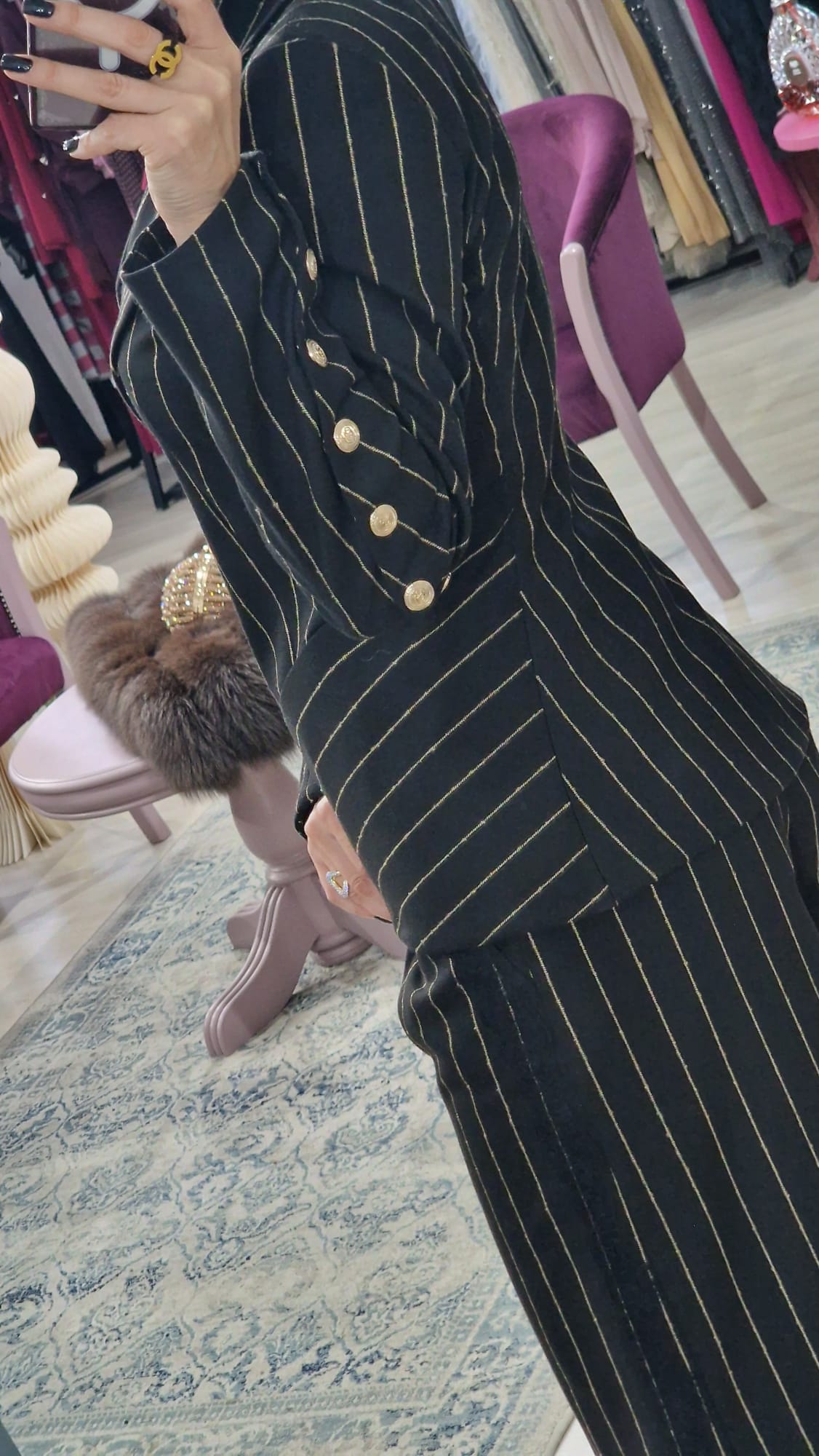 Sacou dama cu dungi aurii subtile care confera un aer sofisticat si modern. Sacoul este pus in valoare de nasturii metalici aurii cu design elegant, ce adauga un accent luxos tinutei.